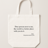 UPDATE: due to high demand the Dear Person Next To Me Tote Bagcurrent stock is very limited!